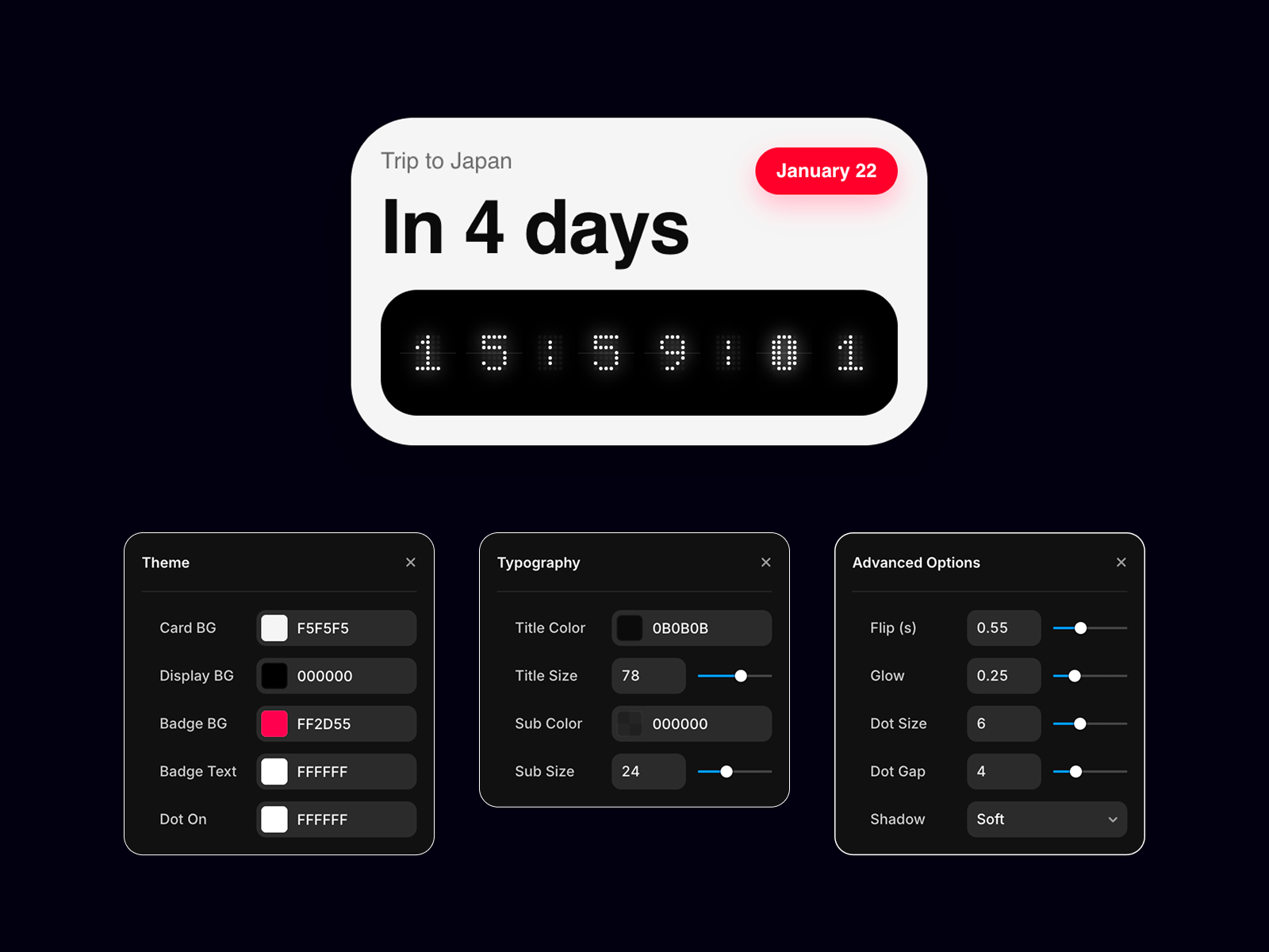 Dot Matrix Countdown Timer Flip + Dot-Matrix Component for Framer. Create a high-impact countdown timer with a retro dot-matrix display and smooth flip animation. Great for launches, promotions, events, travel countdowns, and any “coming soon” moment.