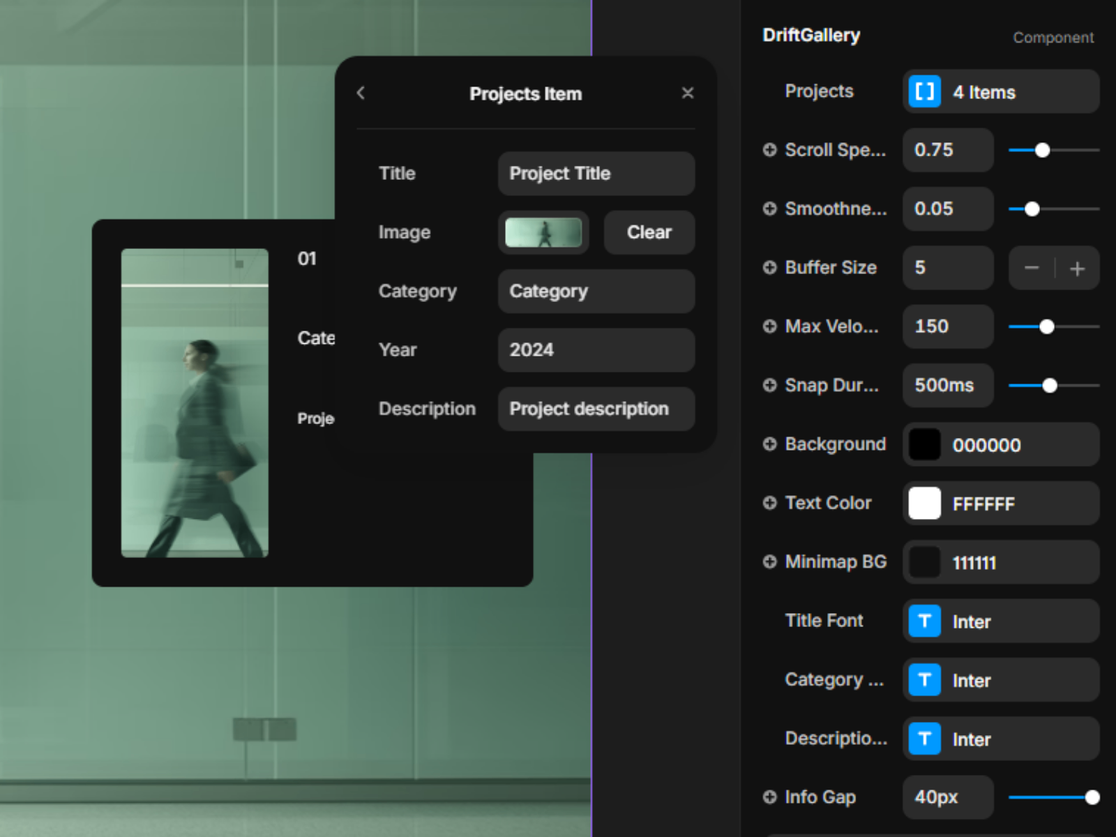 SEO Keywords Infinite Scroll Slider, Parallax Image Gallery, Framer Portfolio Component, Virtual Scrolling UI, Project Showcase Slider, Cinematic Web Animation, Minimap Navigation, Responsive Image Loop.