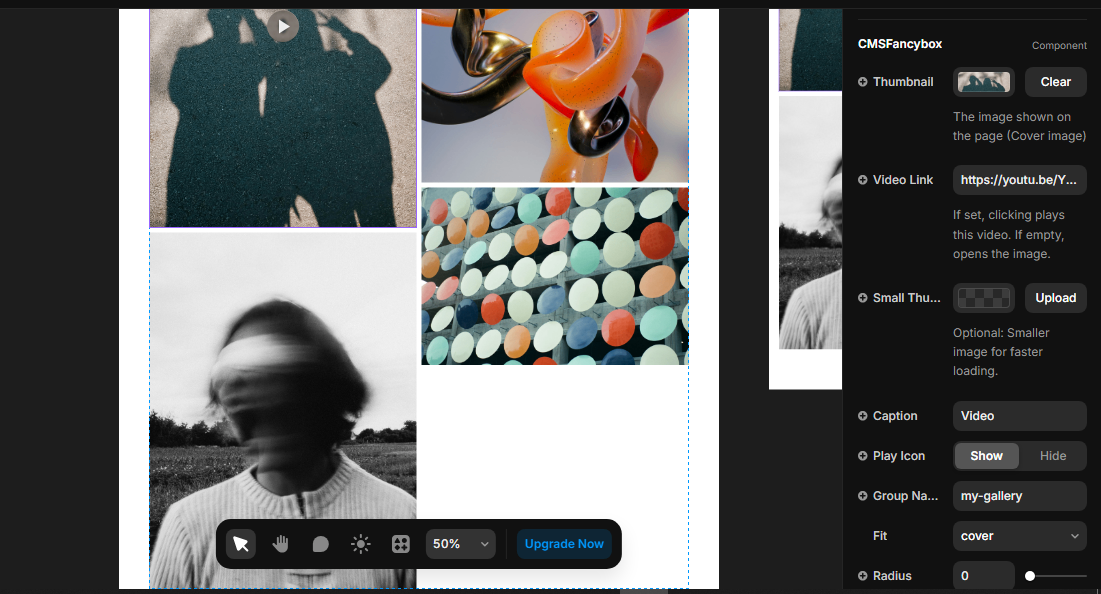 Gallery Grouping: Use the "Group Name" property to automatically link multiple items on a page into a single, swipeable gallery.