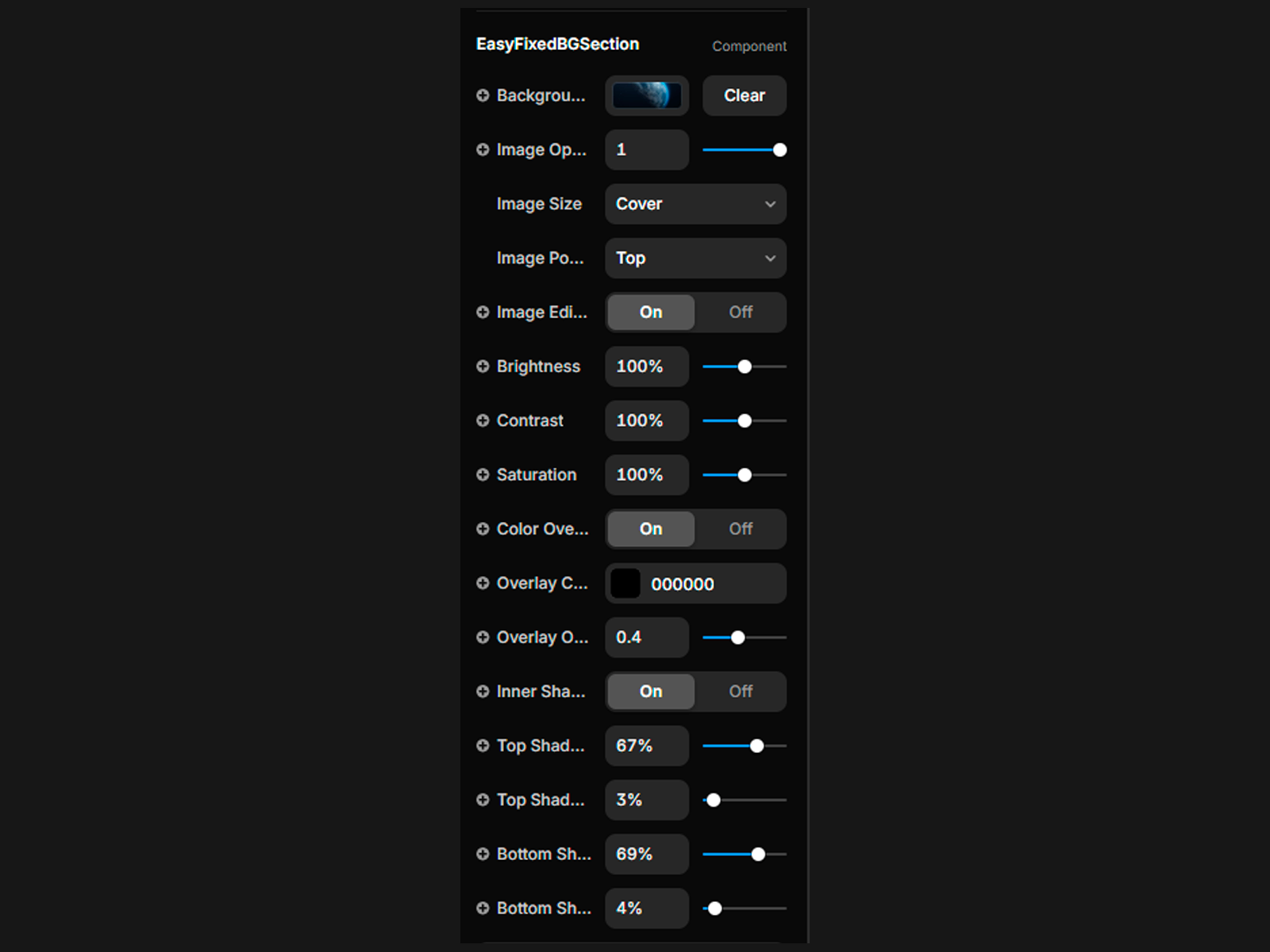 Fixed Background Session Component in Framer: Customize filters, shadows, overlay color, and more in seconds.