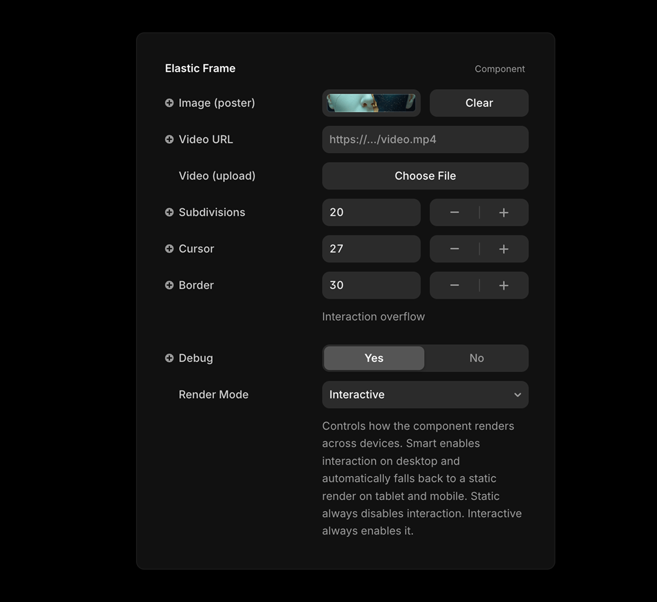 Elastic Frame is highly customizable and gives you full control over how the interaction behaves. You can adjust mesh resolution, cursor size, and overflow area, fine-tune the visual response with debug mode, and choose how the component renders across devices. The effect can be subtle and elegant or bold and playful, depending on your settings.
