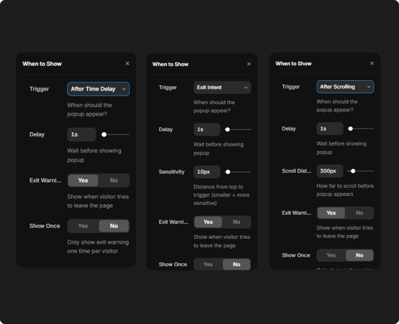 Choose when your popup appears: after a time delay, when users try to leave (exit intent), or after scrolling a certain distance.