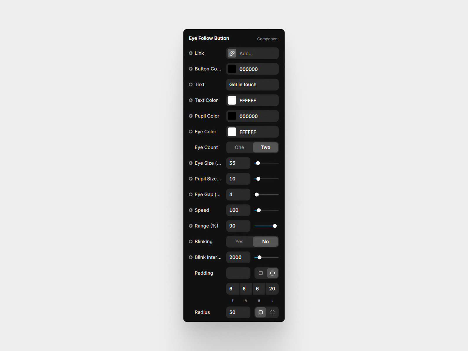 Interactive button with two animated eyes whose pupils follow the cursor, featuring many customizable eye properties for playful, engaging modern interfaces.