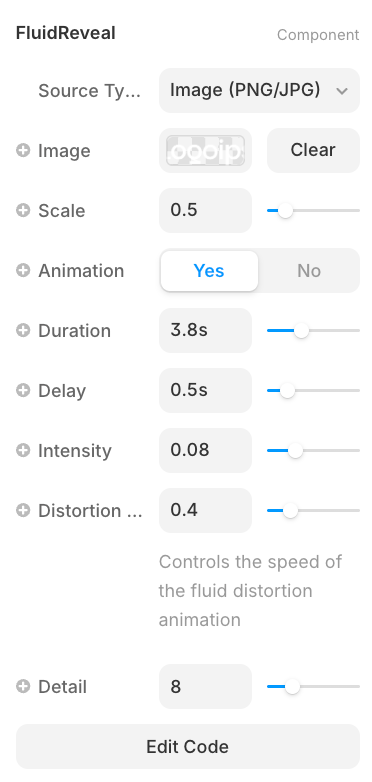 Transform your logo into a mesmerizing liquid experience with Fluid Reveal. This component creates a smooth, animated reveal effect using advanced shader-based distortion that makes your logo appear to flow.