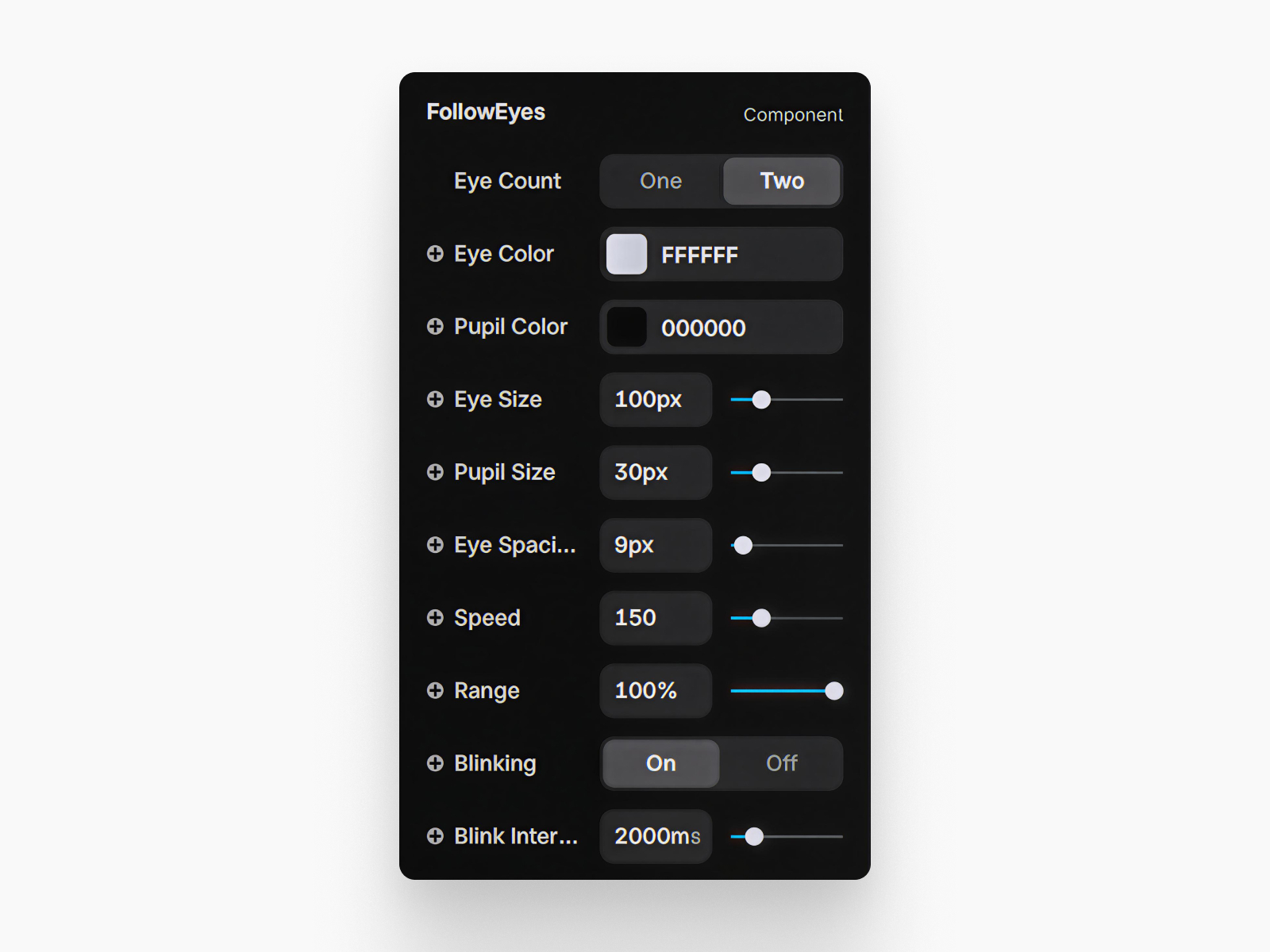 A minimal eye-tracking component with blinking. FollowEyes lets you use one or two eyes that smoothly follow the cursor and add playful motion to any design.