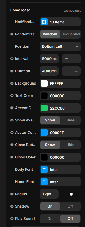 Lightweight, corner-pinned toasts that cycle through recent purchases or signups with avatar/initials, smart timing, progress bar, click-through links, and optional sound effects.