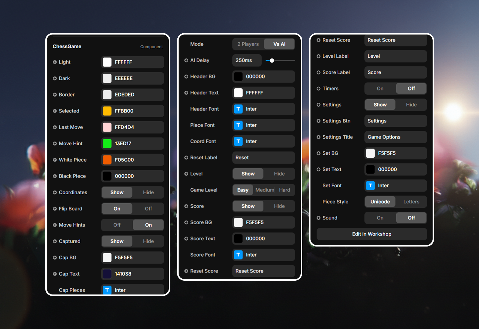 UI Elements: Toggle the visibility of the Header, Score, Level, and Captured pieces sections. Customize every label text (e.g., "Reset Score", "Game Options") to fit your language or tone.
