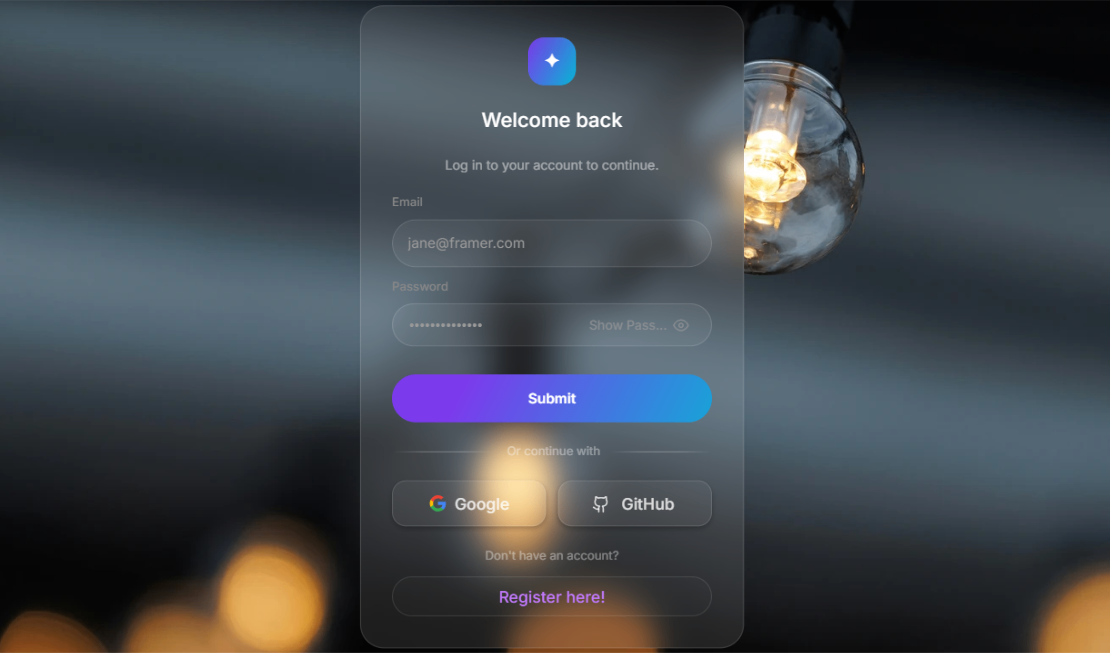 "Or continue with" divider with Google and GitHub social login buttons