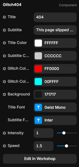 With complete control over title, subtitle, glitch colors, background, intensity, and speed, you can adapt the entire visual style to match any brand identity—from playful motion-heavy websites to ultra-modern dark UIs.The component uses Geist Mono for the title to enhance the techy glitch effect and Inter for the subtitle to maintain readability and balance.