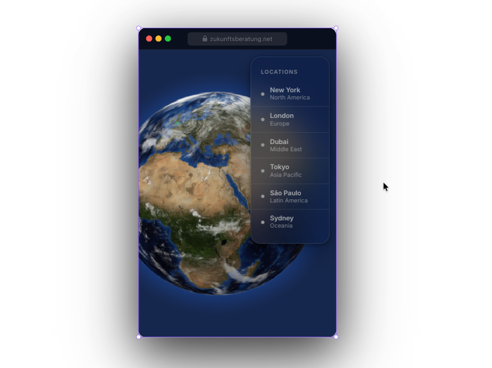 Auto-rotating globe with smooth hover-to-city animation