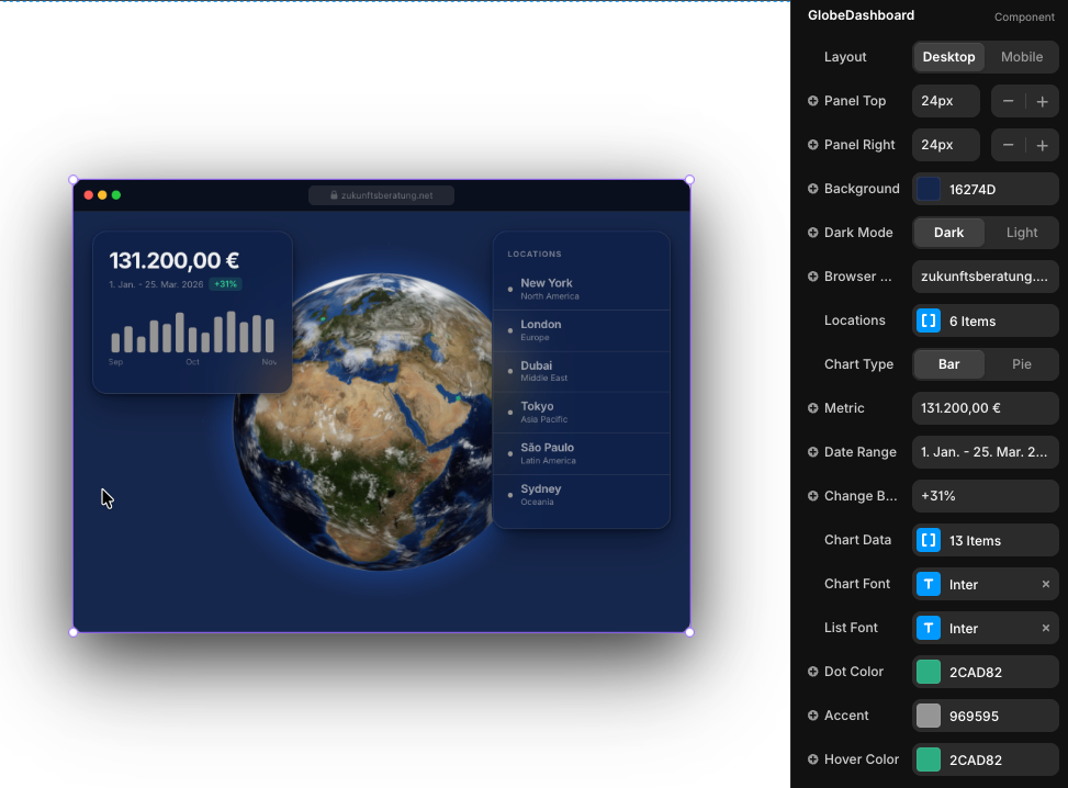 An interactive dashboard with a live-rotating 3D globe, animated city markers, and glassmorphism panels. Includes a built-in bar or pie chart panel. Switch to mobile layout for an edge-clipped globe with a focused city list. No code needed.