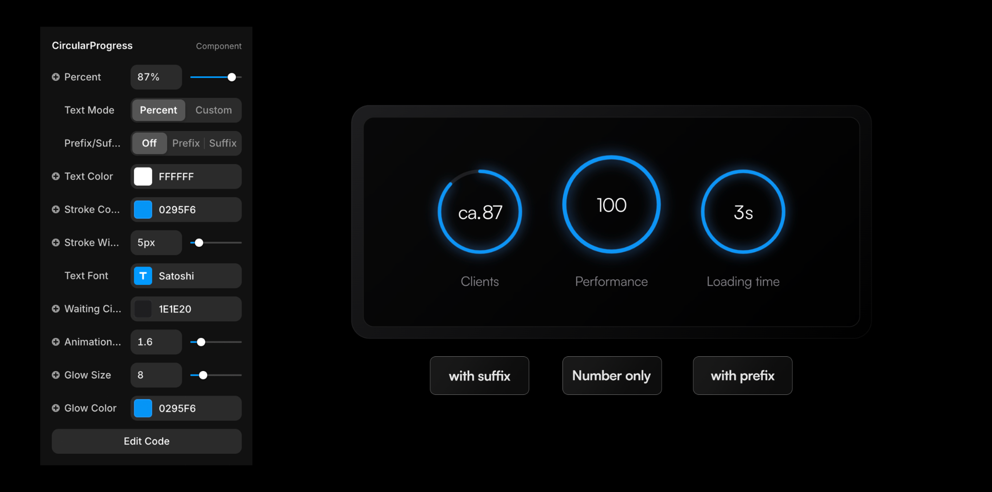 Animated circular progress stat with percent or custom text, prefix or suffix support, editable colors, glow, font, stroke width and timing.