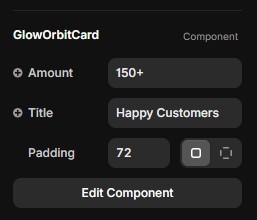 • Smooth orbiting glow dot animation• Subtle 3D hover tilt effect• Realistic depth interaction• Fully responsive layout• Editable stat and label text (e.g., “150+” / “Customers”)• Customizable padding (default: 72)• Padding controls overall card size increase or decrease to fit your layout• Clean, modern dark UI design• Lightweight and performance-optimized• Ready-to-use Framer component