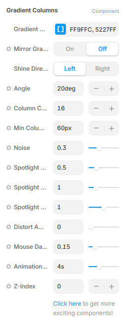 Create stunning gradient columns with spotlight, shine, and noise effects. Fully customizable, interactive, and mobile-friendly.