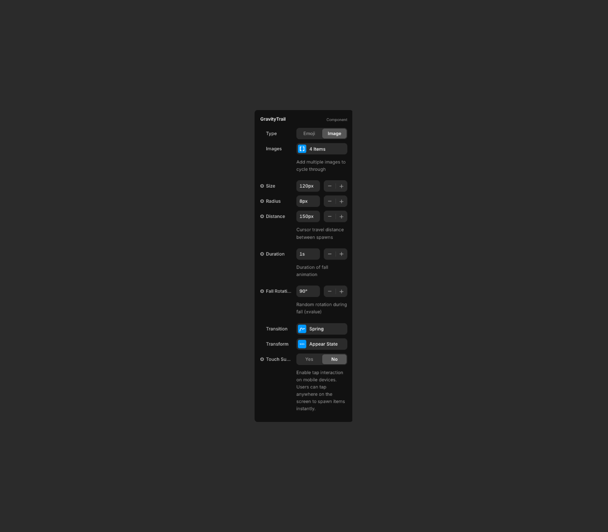 Tune the Physics Adjust the feel of the gravity. Use the Spawn Distance slider to control density—lower values create a thick stream, higher values create elegant, spaced-out drops.• Final Touch: Tweak the Animation Duration to control how fast items fall. A slower duration feels like a feather floating; a faster one feels like a solid object dropping.