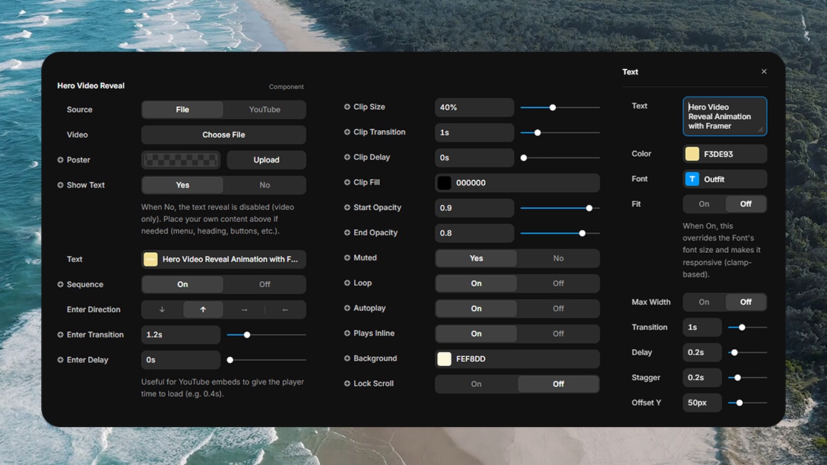 The animation combines an entrance motion and a scalable reveal effect. The initial clip (Clip Size) respects the aspect ratio of the component, ensuring a clean and consistent visual before expanding to full size.