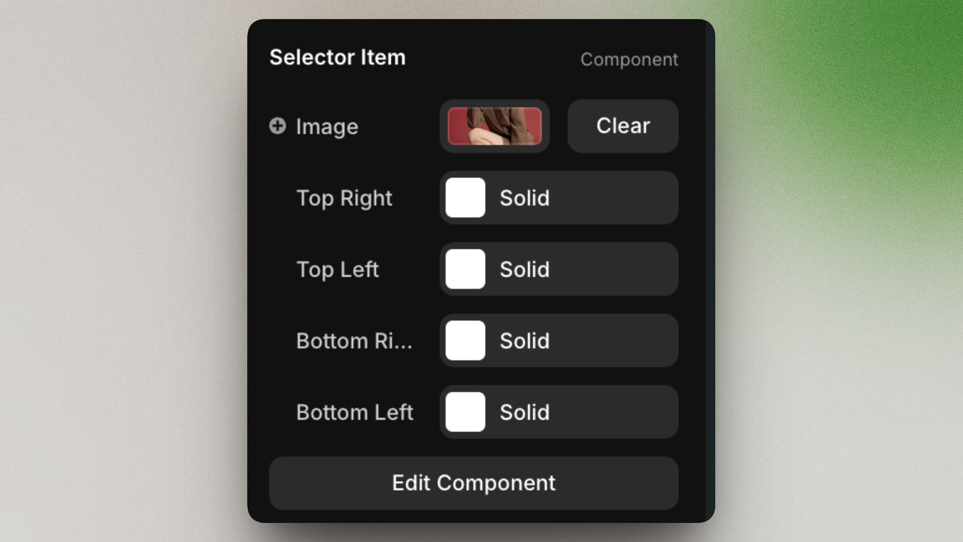 You can control the selected image, corner indicator styles (top-left, top-right, bottom-left, bottom-right), visibility, opacity, and overall appearance directly from the properties panel. The component integrates smoothly into existing layouts and works responsively across breakpoints.