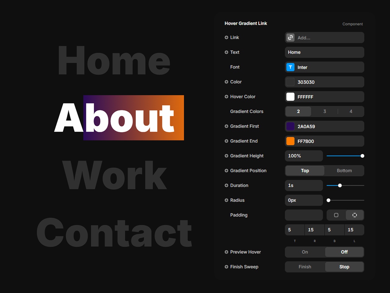 You can choose whether the gradient animation finishes its sweep or stops when the cursor leaves. While the animation is running, you can either lock it or allow it to restart on repeated hover.