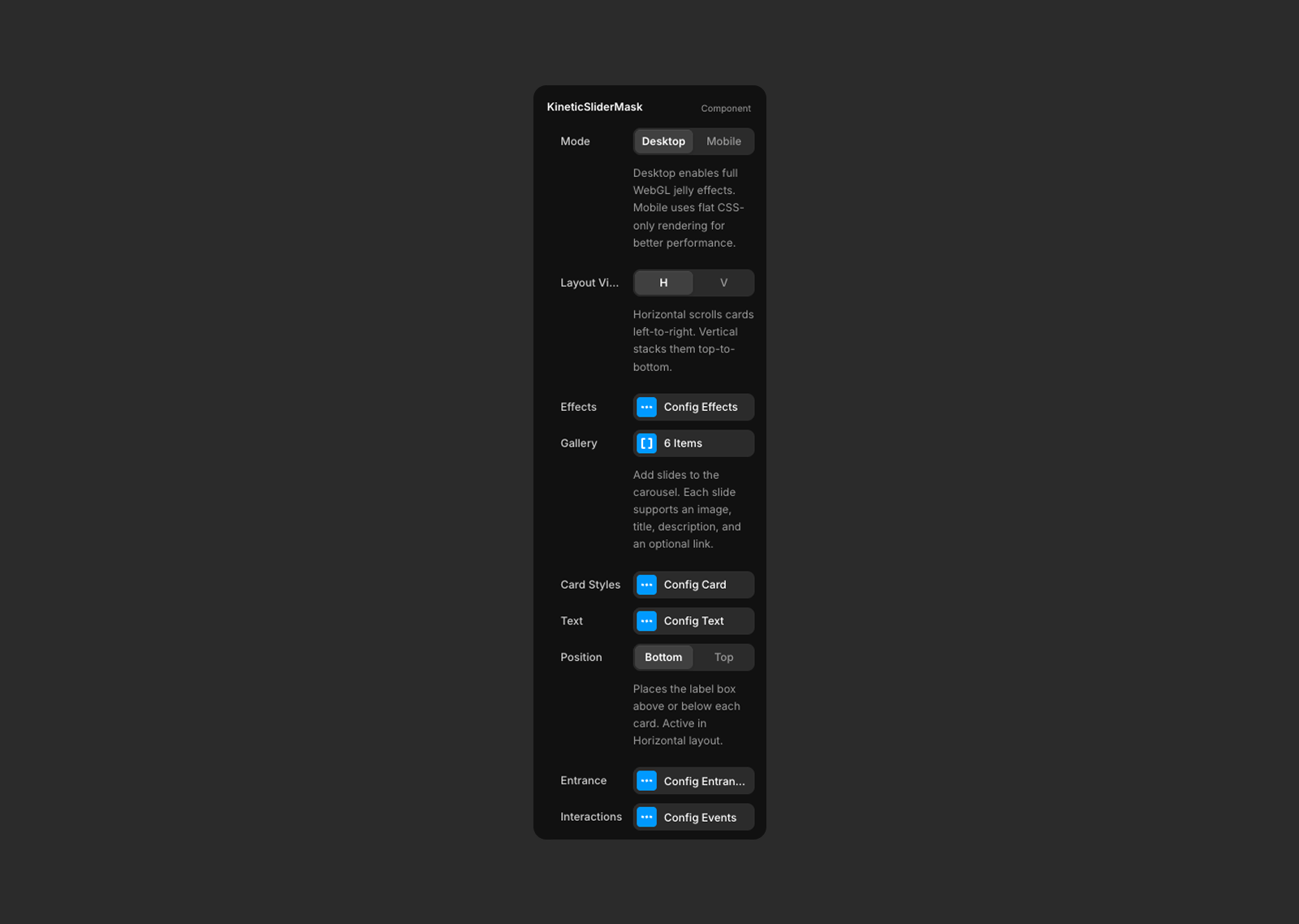 Building a WebGL carousel with staggered entrances, physics-based distortion, chromatic aberration, and synchronized text animations from scratch is a multi-week engineering project — not a design task. Kinetic Slider Mask eliminates that gap entirely. Every uniform, every shader, every rAF loop has already been tuned and battle-tested. You get production-ready motion quality that holds up across devices, browsers, and real user interactions, without touching a single line of GLSL.