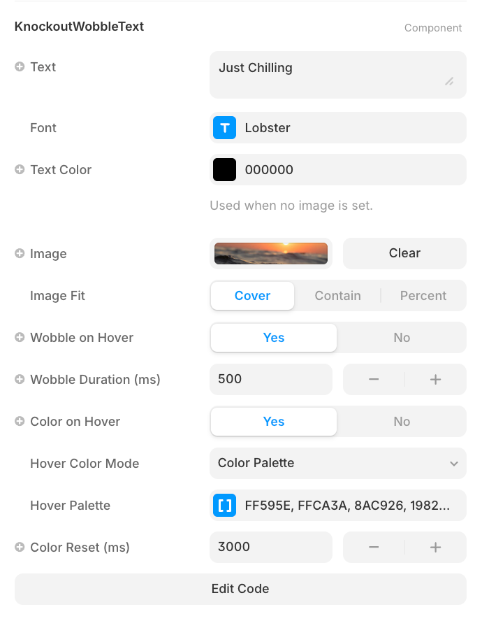 How it works Upload any image and it will be clipped inside your text — so your letters become windows into the image beneath. Hover any individual letter and it wobbles with a smooth animation, with an optional color flash that resets automatically.