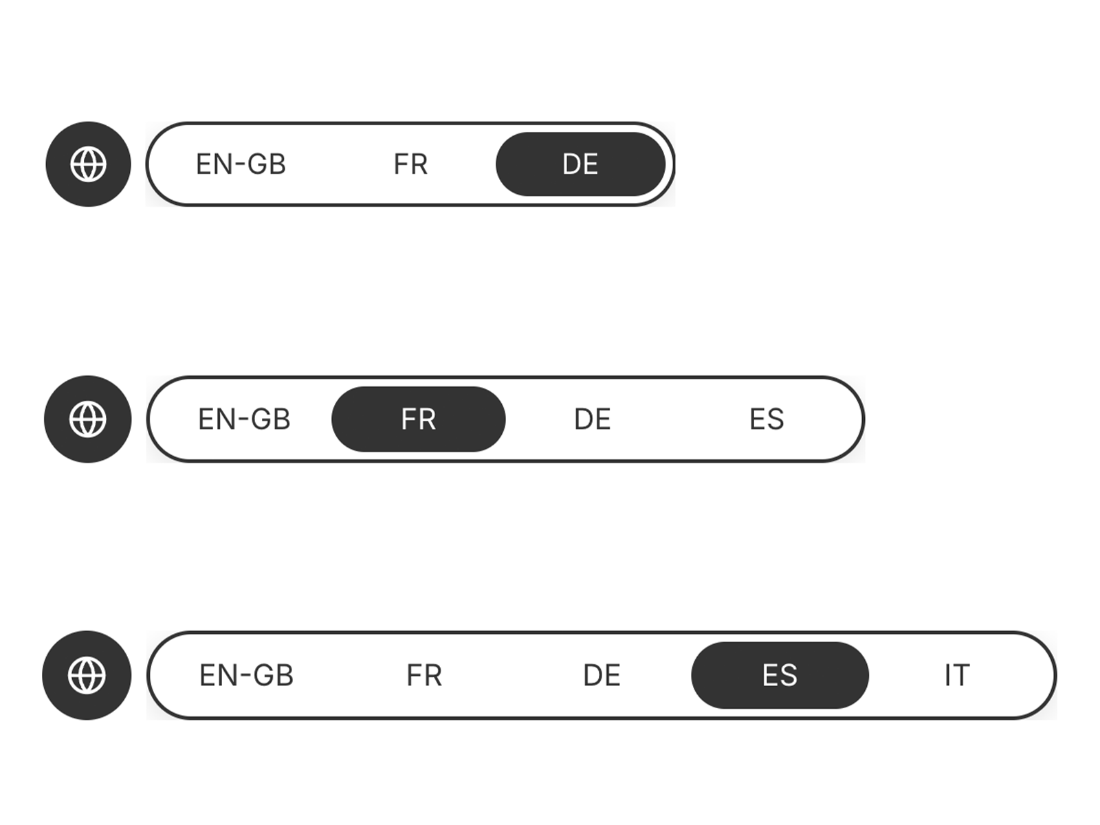 A compact language switcher that reveals a text-based selector when you click or hover the globe icon.