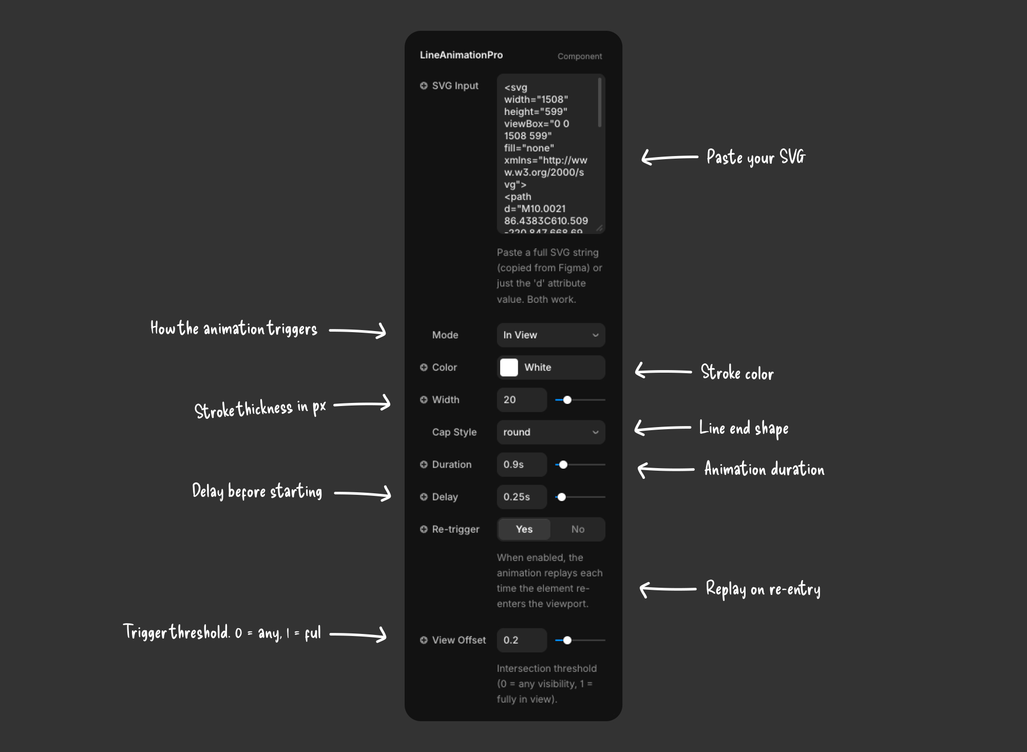 Line Animation Pro is a precision-built component for animating any SVG path in Framer. Paste your path, pick a mode, and get a production-ready drawing animation — no extra code needed. Whether you're adding motion to a portfolio, storytelling section, or decorative illustration, this component makes your site feel intentional and alive.