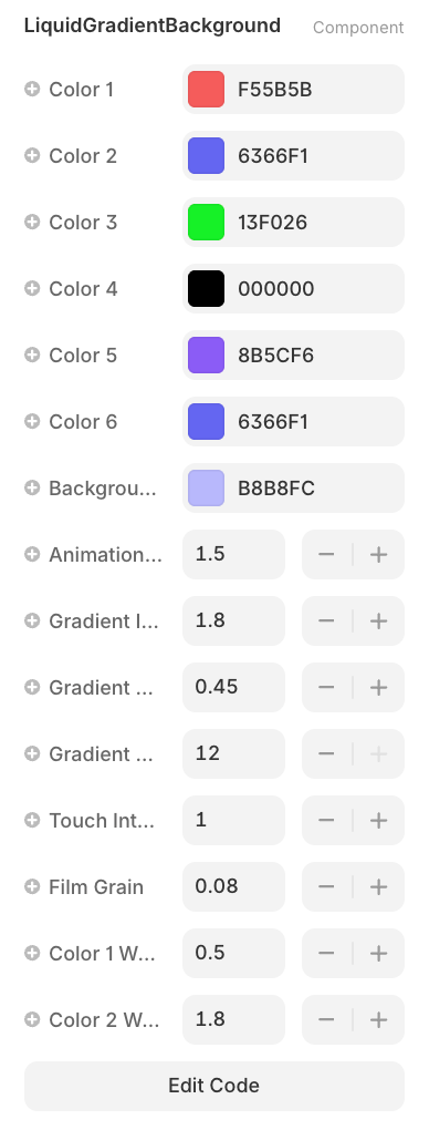 Full Animation Controls: Adjust speed, overall intensity, individual gradient size, and touch interaction strength to match your project's vibe.