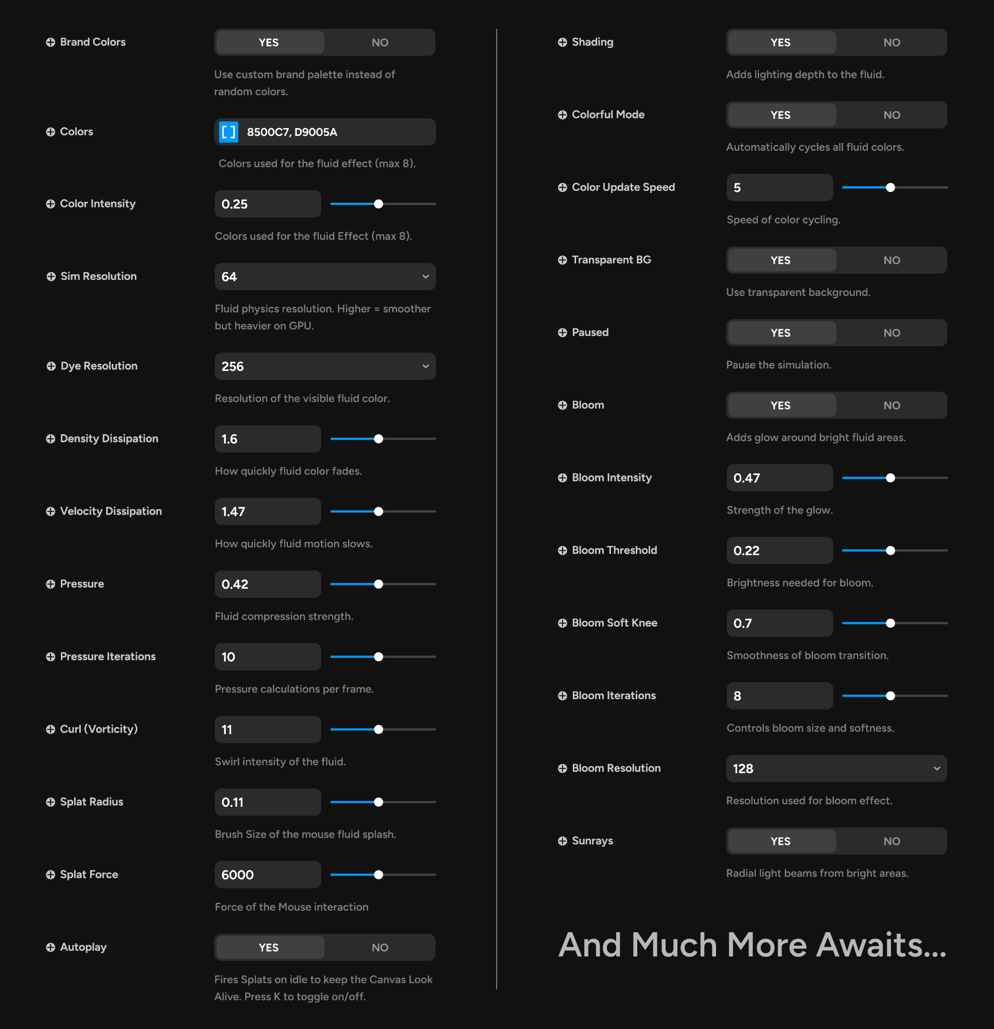 Visuals & Dissipation: Adjust how quickly the colors and velocity fade away, and set your ideal Color Cycle Speed.