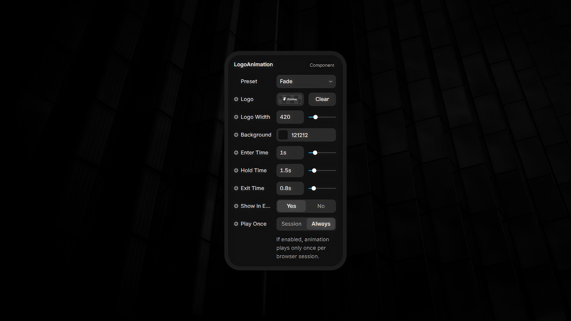 Smart Session Memory Includes a built-in "Play Once" toggle using sessionStorage. This ensures returning visitors aren't forced to watch the intro repeatedly, keeping the user journey frictionless.
