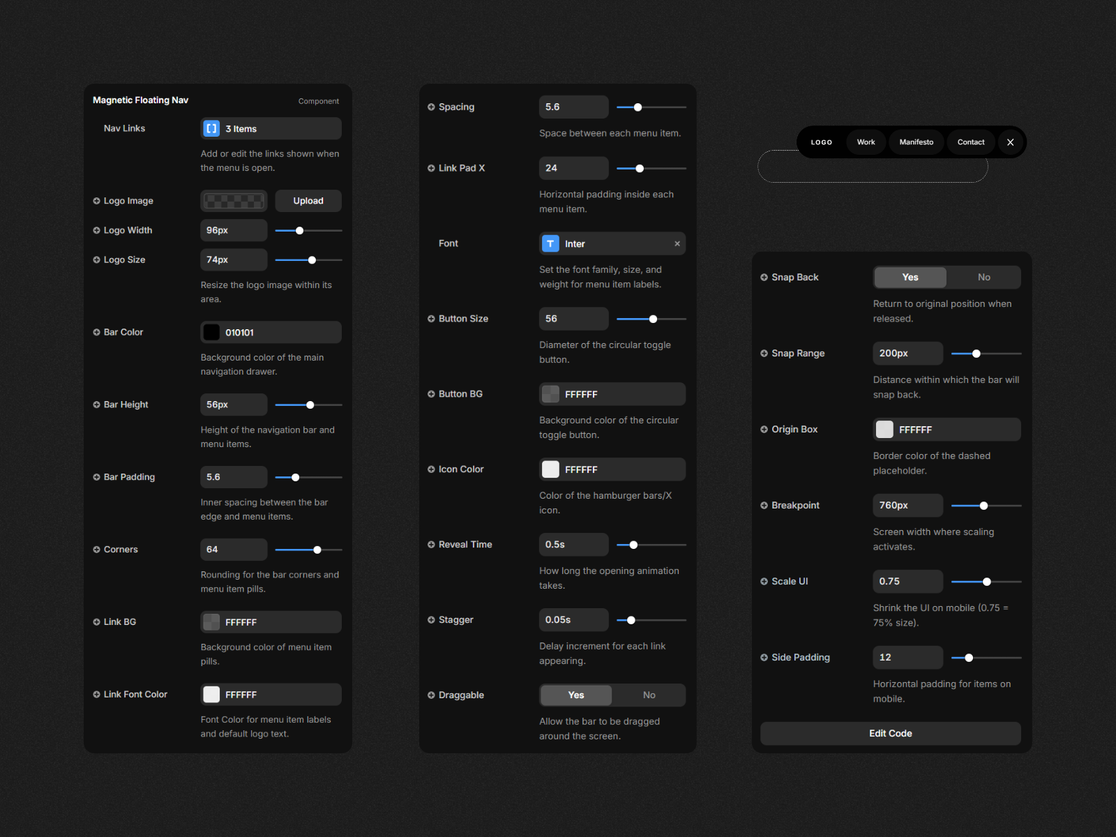 Magnetic Float Nav reimagines site navigation as a floating, interactive object. It breaks free from the top bar convention by sitting anywhere on the canvas, snapping back to its origin with a satisfying spring physics feel, and expanding into a smooth reveal of your menu items - all without a single line of code.