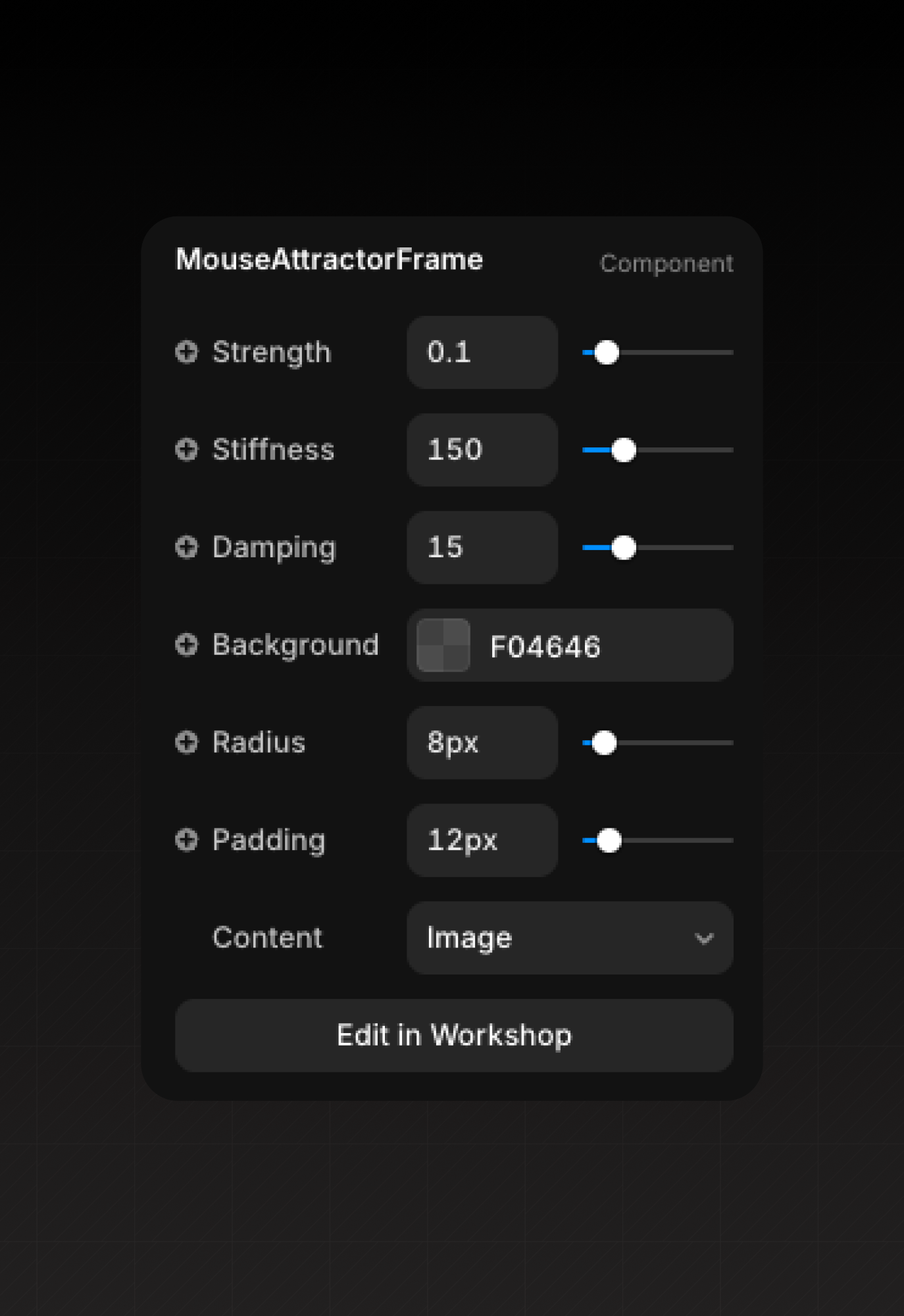 The Magnetic Frame component adds a captivating interactive effect to your UI. Any element placed inside the frame becomes magnetically attracted to the user’s cursor when hovered over. As the mouse moves near the frame, the content subtly shifts and follows the pointer, creating a smooth, dynamic, and visually engaging experience.
