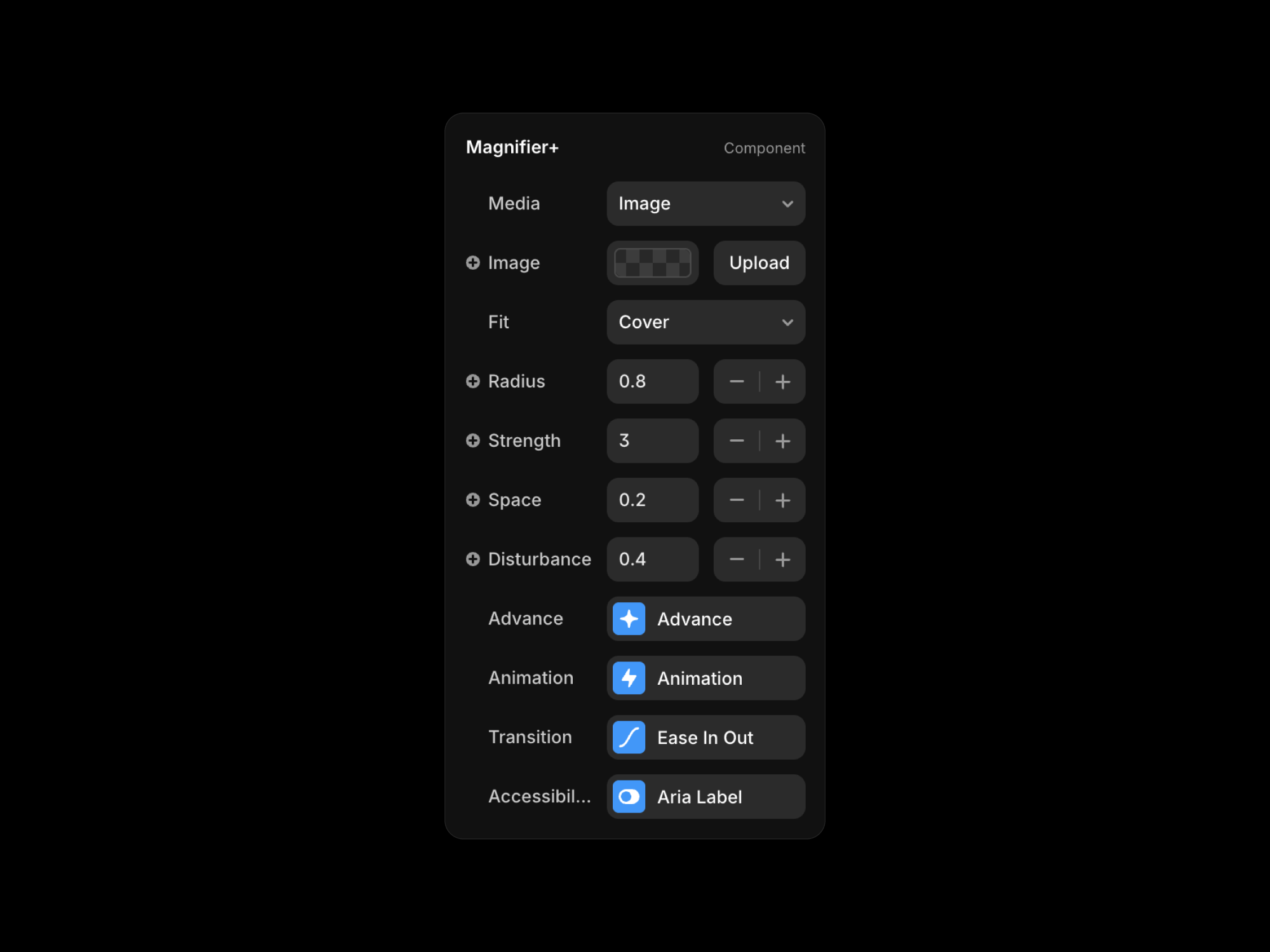 Magnifier+ introduces a liquid distortion effect that simulates the optical nature of liquids, revealing stunningly immersive visual forms.Magnifier+ deeply integrates WebGL into Framer, delivering refined visuals while preserving performance. Focus on your creative vision — then publish it with ease.