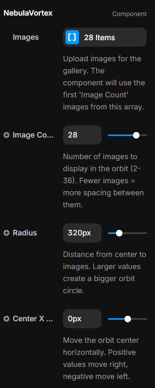 Image Count – Choose how many images display in the orbit (2–36). Fewer = more spacing.