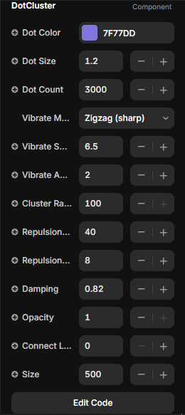 You get full control over everything like how many particles, how big, how fast they vibrate, how aggressively they flee your cursor, how far they reach to connect with neighboring dots. Want a dense, chaotic storm of particles? Crank the count and the zigzag vibration. Want something quieter and more meditative? Drop the speed, soften the damping, let them drift. The whole personality of the component changes based on a few sliders.
