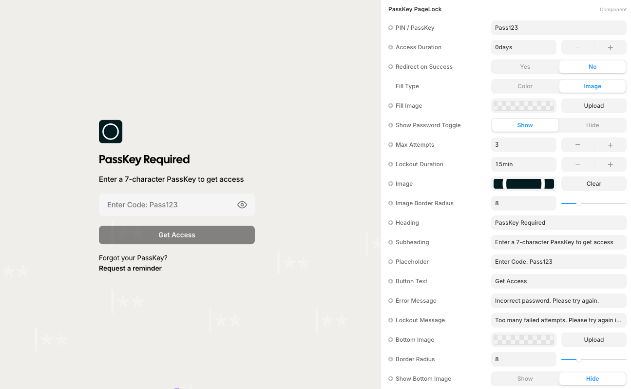 This component lets you create a PIN or PassKey to lock individual pages or CMS detail pages, gating access until the user enters the correct code.
