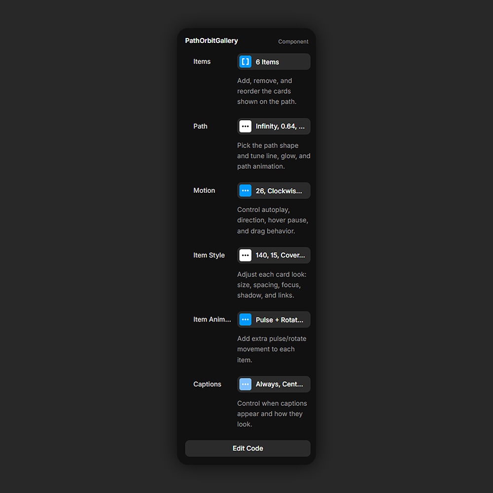 Path Orbit Gallery is a premium multi-shape image gallery for Framer. It helps designers place images on animated paths that feel more editorial and expressive than a standard orbit carousel.