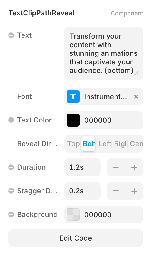 4. Pick Reveal Direction then tune Duration and Stagger.