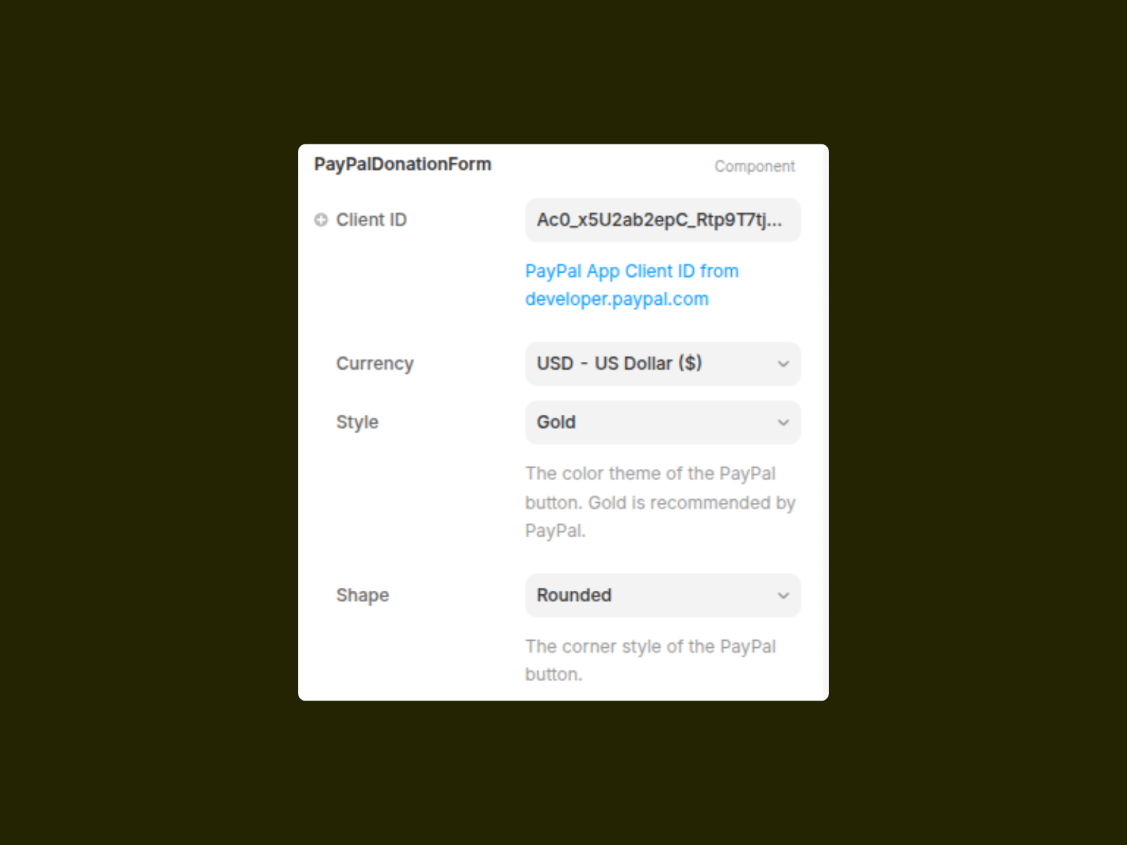 Accept donations directly on your Framer site ,no backend, no code. This component integrates PayPal's secure payment flow with a fully customizable form, allowing you to collect donor details and process payments directly within your design tool.