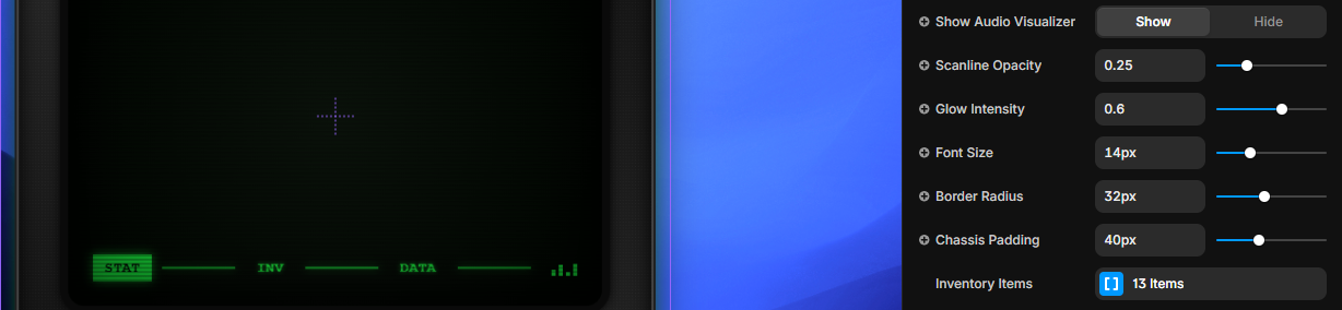 Scanline opacity · Glow intensity · Font size · Border radius · Padding