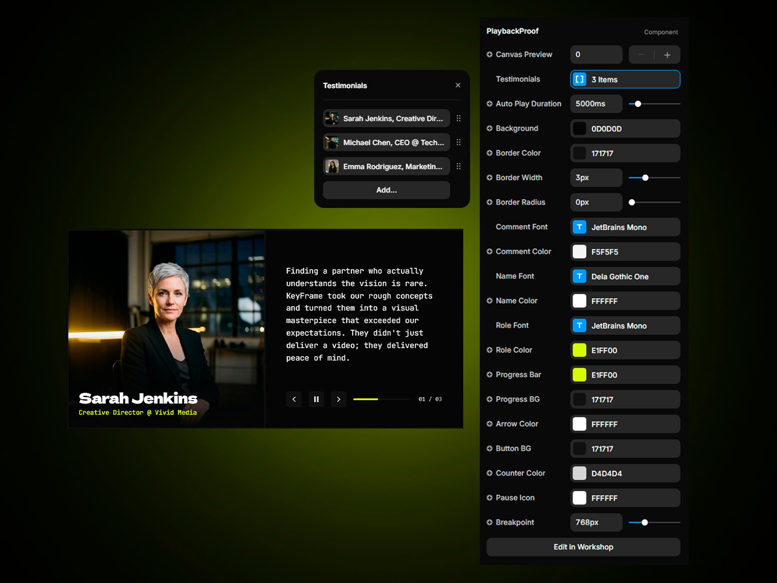 Playback Proof is a high-performance testimonial component designed for those who want to elevate social proof into a cinematic experience. By adopting a media-player aesthetic, it transforms static feedback into a dynamic, interactive element that commands attention.