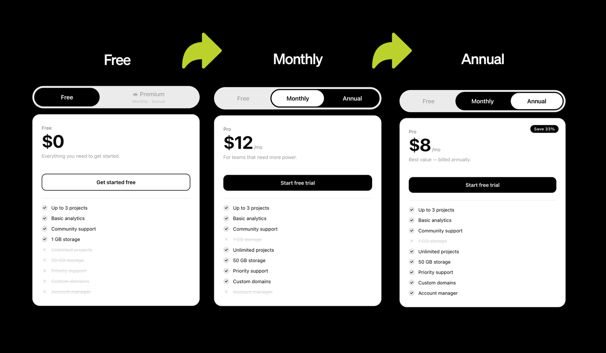 Annual Savings Badge: A high-visibility, scale-animated badge that automatically highlights value when the user selects the annual tier.