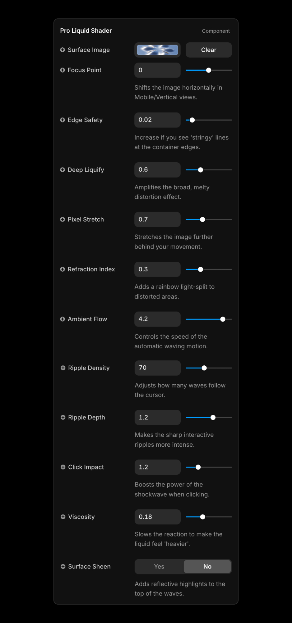 Every parameter can be tuned, from calm and viscous motion to sharp, elastic distortion, allowing the shader to match different brand personalities.