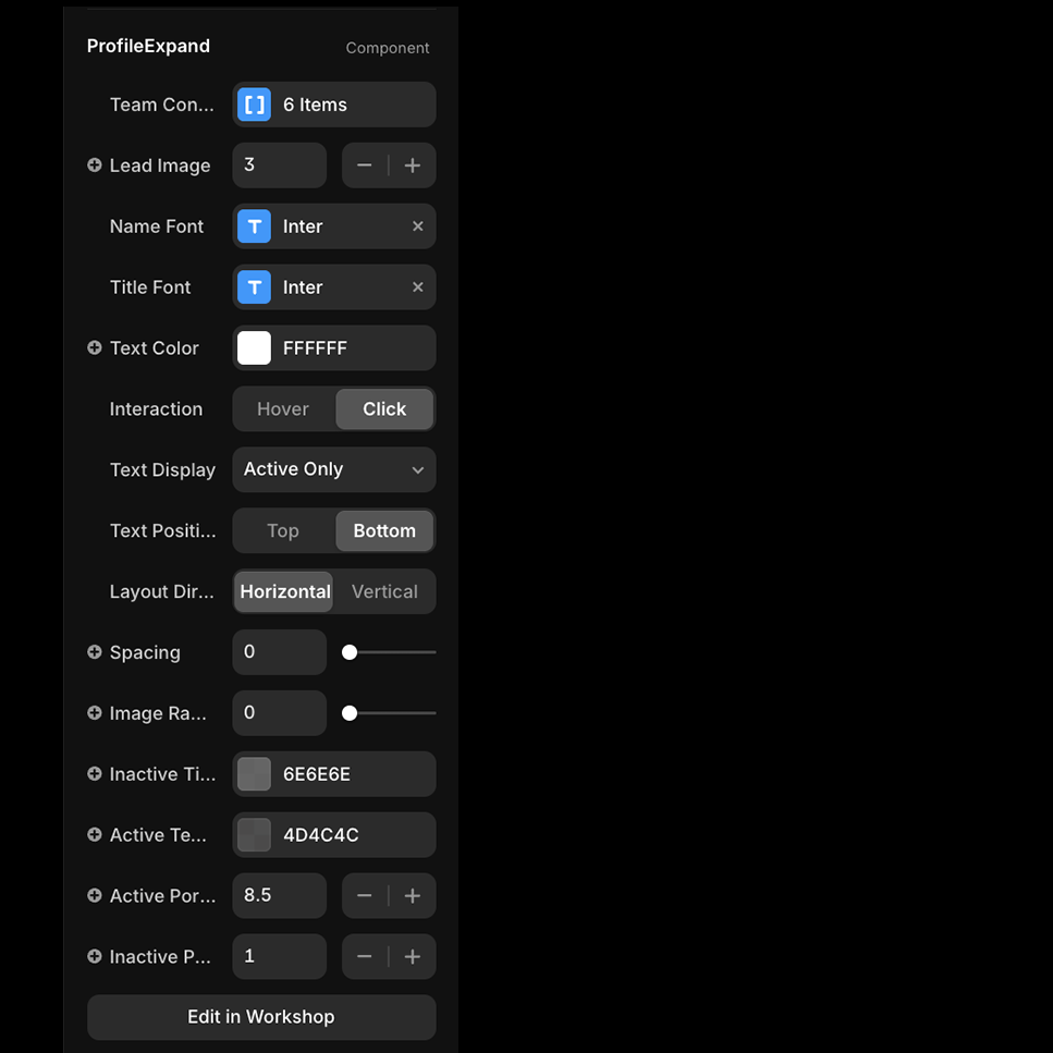 This Framer component presents up to 6 people with subtle profile expansion. Highlight a lead portrait, control text visibility, and fine-tune spacing, radius, and overlay colors for a polished “Meet the Team” section.