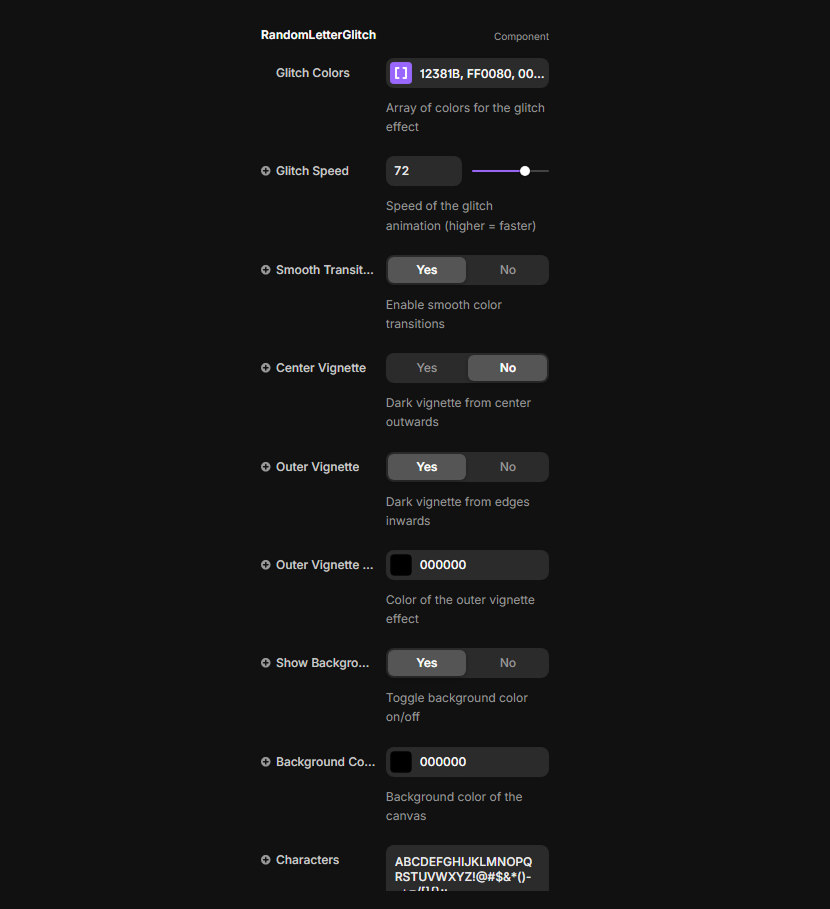 A dynamic, customizable Matrix-style random letter glitch effect component for Framer. Features animated characters with smooth color transitions and vignette effects.
