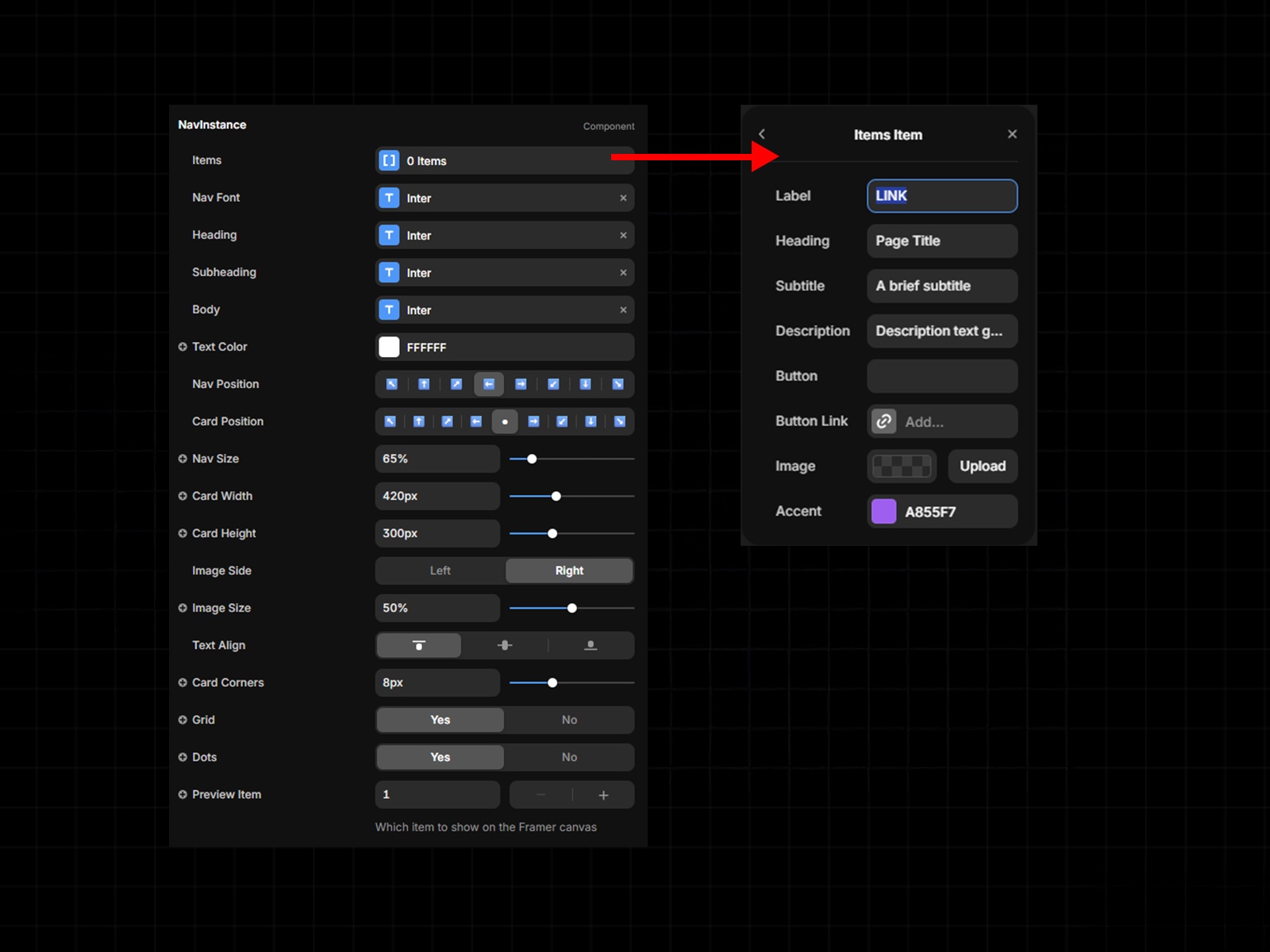 Fonts — all four font controls (Nav, Heading, Subheading, Body) accept any Framer font, so it works with custom typefaces.
