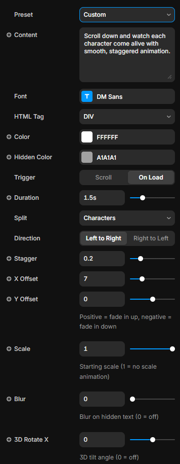 • Custom Mode — Full control over stagger, offsets, blur, rotateX, perspective, and scale