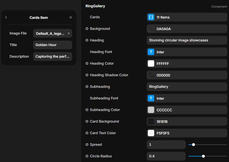Fully customizable with fonts, colors, shadows, and motion controls, RingGallery adapts to any creative vision. From sleek product displays to cinematic mood boards, this component transforms galleries into immersive experiences.
