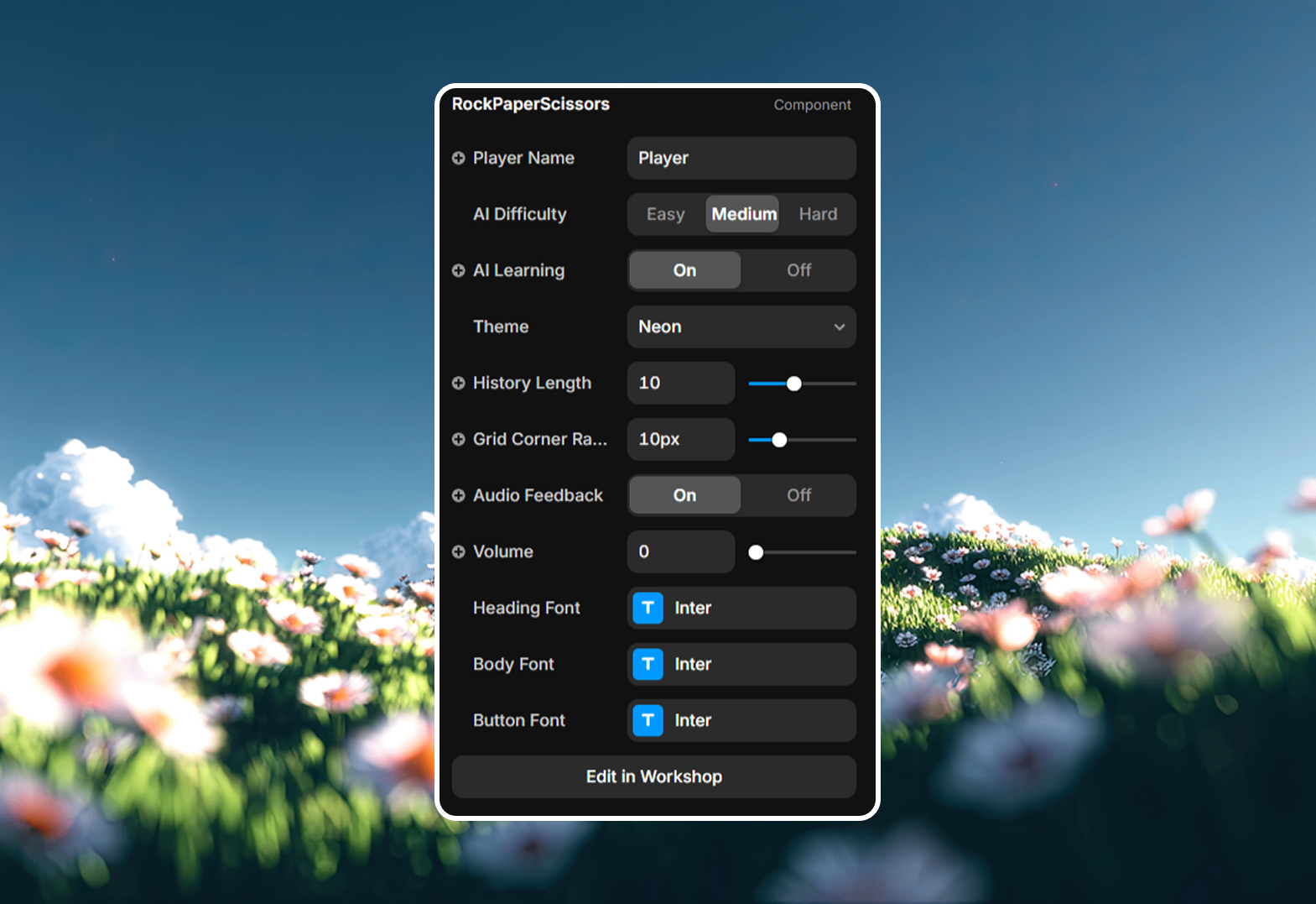 Rock Paper Scissors adds a classic, interactive mini-game to your Framer projects. It’s the perfect way to add a bit of "delight" to your site, keeping visitors engaged for longer. Drop it into a 404 page, a "Fun" section of your portfolio, or a sidebar and let users challenge the AI. With built-in themes like "Neon" and fully responsive controls, it fits seamlessly into any design.