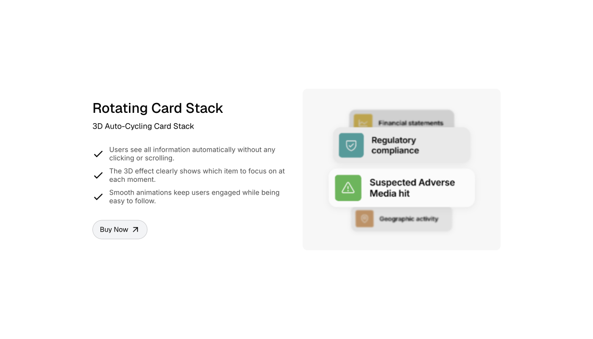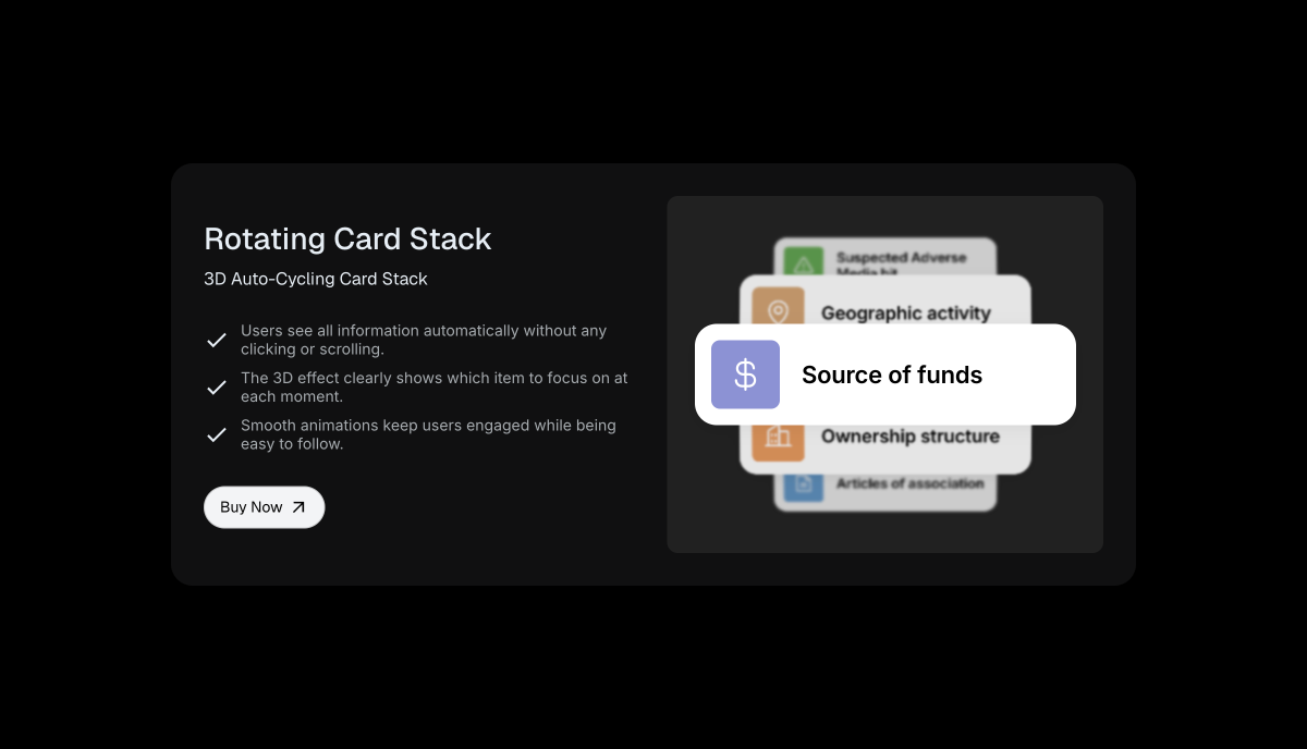 Rotating Card Stack gives you a production-ready, polished 3D carousel that just works. Clean animations, perfect perspective transitions, and a slick modern aesthetic—without the headache of building it yourself.