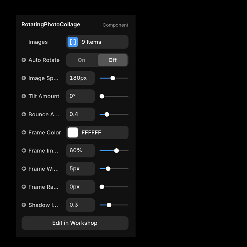 Create a circular photo collage that rotates continuously or advances on interaction. Fine-tune frame styling and motion while keeping the design clean, minimal, and easy to use.